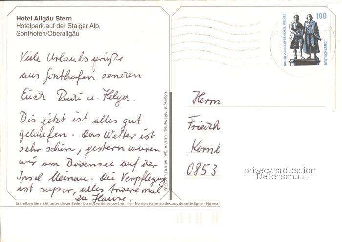 72366070 alte Postkarte Sonthofen Oberallgaeu Hotel Allgaeu Stern Hotelpark Staiger Alp Allgaeuer Alpen postalisch gelaufen Erhaltung siehe scans KatCode: 11110009780139