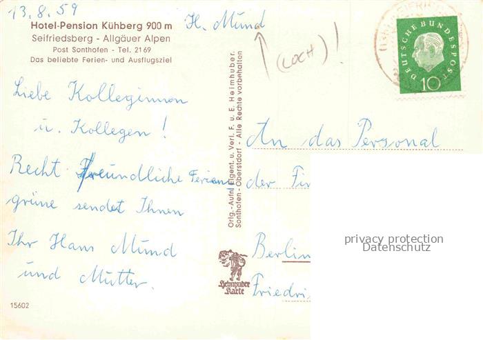 74043056 alte Postkarte Sonthofen Oberallgaeu Hotel Pension Kuehberg postalisch gelaufen Erhaltung siehe scans [WerneD78] KatCode: 11110009780139