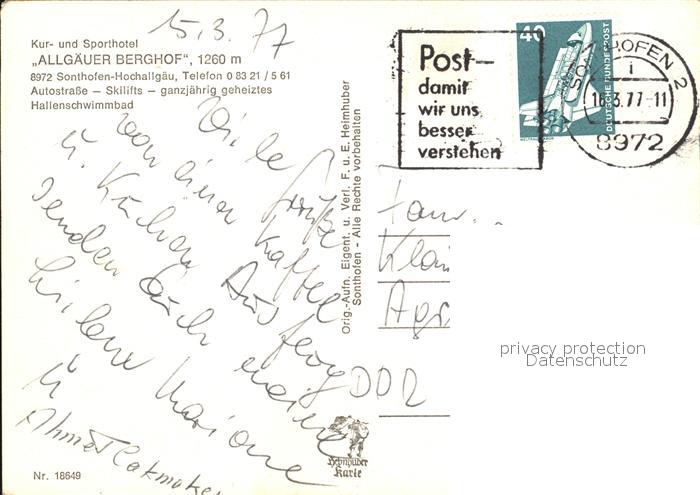 72447803 alte Postkarte Sonthofen Oberallgaeu Kur-Sporthotel Allgaeuer Berghof postalisch gelaufen Erhaltung siehe scans KatCode: 11110009780139