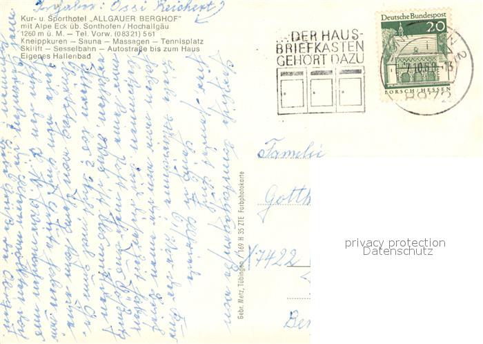 73636944 alte Postkarte Sonthofen Oberallgaeu Kur- und Sporthotel Allgaeuer Berghof mit Alpe Eck postalisch gelaufen Erhaltung siehe scans [FriedD77] KatCode: 11110009780139