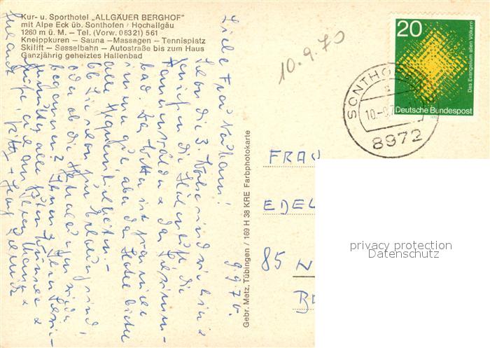 73073169 alte Postkarte Sonthofen Oberallgaeu Kur und Sporthotel Allgaeuer Berghof mit Alpe Eck Fliegeraufnahme postalisch gelaufen Erhaltung siehe scans [WerneD78] KatCode: 11110009780139