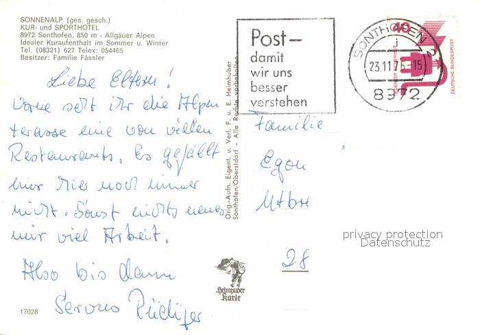 72795652 alte Postkarte Sonthofen Oberallgaeu Kur und Sporthotel Sonnenalp Restaurant postalisch gelaufen Erhaltung siehe scans [FriedD77] KatCode: 11110009780139