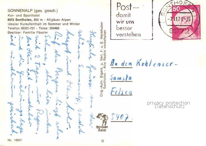 72902590 alte Postkarte Sonthofen Oberallgaeu Kur und Sporthotel Sonnenalp Restaurant postalisch gelaufen Erhaltung siehe scans [FriedD77] KatCode: 11110009780139
