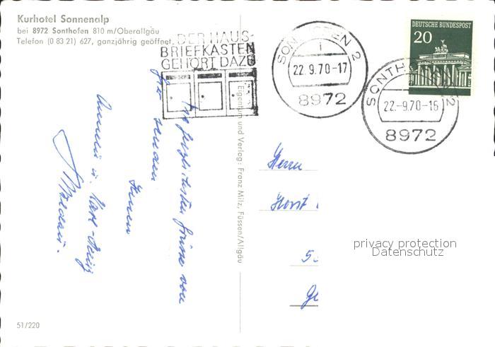 72481909 alte Postkarte Sonthofen Oberallgaeu Kurhotel Sonnenalp postalisch gelaufen Erhaltung siehe scans KatCode: 11110009780139