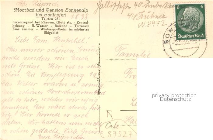 73782913 alte Postkarte Sonthofen Oberallgaeu Moorbad-Pension Sonnenalp Aussenansicht Kuenstlerkarte A. Schaefer postalisch gelaufen Erhaltung siehe scans [LiesaD40] KatCode: 11110009780139