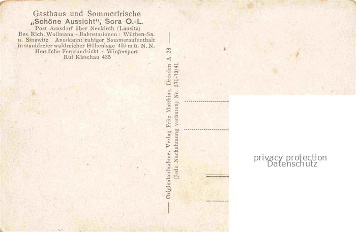 74024876 Sora Oberlausitz Wilthen Bautzen Sachsen Gasthaus Schoene Aussicht postalisch nicht gelaufen Erhaltung siehe scans [WerneD78] KatCode: 11110014272390