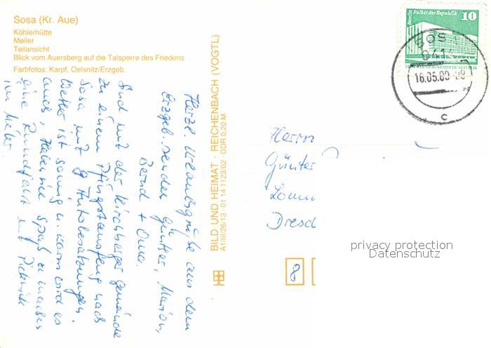 72915065 alte Postkarte Sosa Erzgebirge Koehlerhuette Meiler Blick vom Auersberg auf Talsperre des Friedens postalisch gelaufen Erhaltung siehe scans [LiesaD40] KatCode: 11110014191310