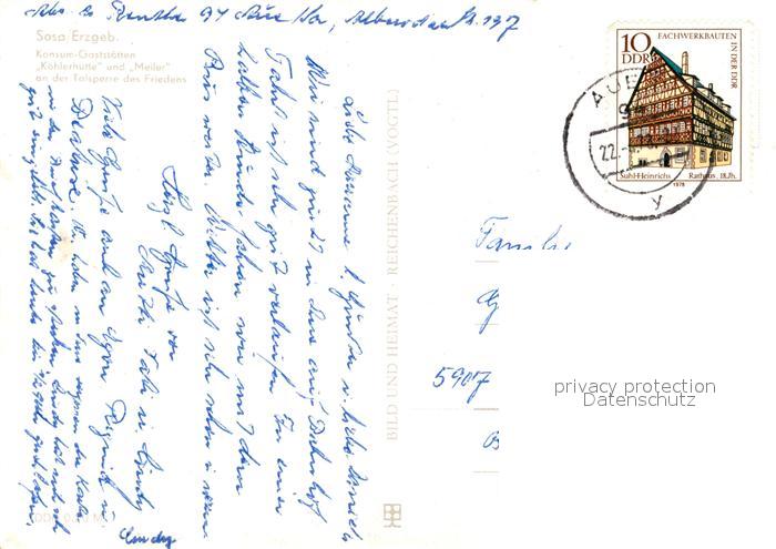 73569962 alte Postkarte Sosa Erzgebirge Konsum Gaststaette Koehlerhuette und Meiler postalisch gelaufen Erhaltung siehe scans [WerneD78] KatCode: 11110014191310