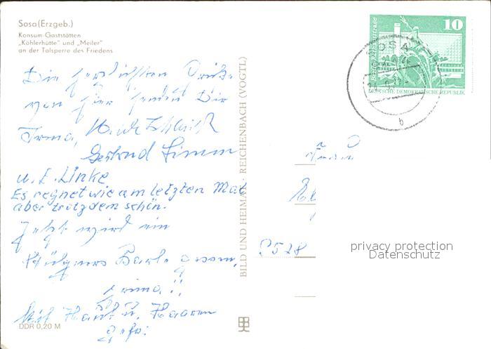 71940320 alte Postkarte Sosa Erzgebirge Konsum Gaststaetten Koehlerhuette Meiler postalisch gelaufen Erhaltung siehe scans KatCode: 11110014191310