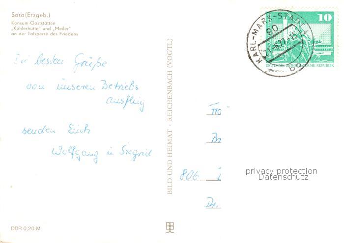 73859306 alte Postkarte Sosa Erzgebirge Konsum Gaststaetten Koehlerhuette und Meiler an der Talsperre des Friedens postalisch gelaufen Erhaltung siehe scans [WerneD78] KatCode: 11110014191310