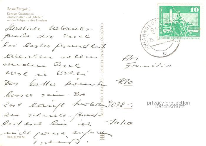 73041609 alte Postkarte Sosa Erzgebirge Konsum Gaststaetten Koehlerhuette und Meiler an der Talsperre des Friedens postalisch gelaufen Erhaltung siehe scans [FriedD77] KatCode: 11110014191310