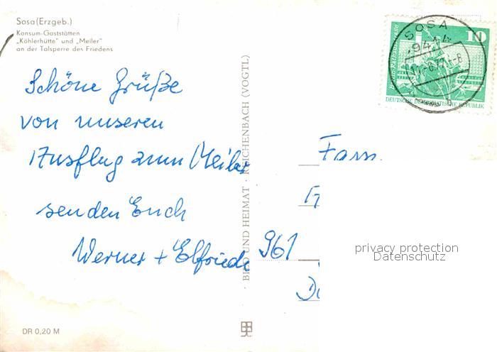 72616325 alte Postkarte Sosa Erzgebirge Konsum Gaststaetten Koehlerhuette und Meiler Talsperre des Friedens postalisch gelaufen Erhaltung siehe scans [FriedD77] KatCode: 11110014191310