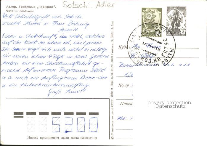 old postcard Sotschi Adler Hotel Horisont postalisch gelaufen Ganzsache (eingedruckte Briefmarke) Erhaltung siehe scans