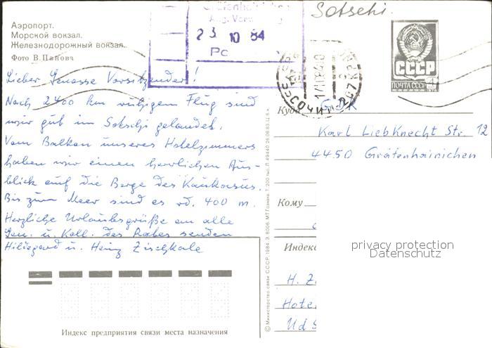 old postcard Sotschi Hafen Bahnhof Flughafen postalisch gelaufen Ganzsache (eingedruckte Briefmarke) Erhaltung siehe scans