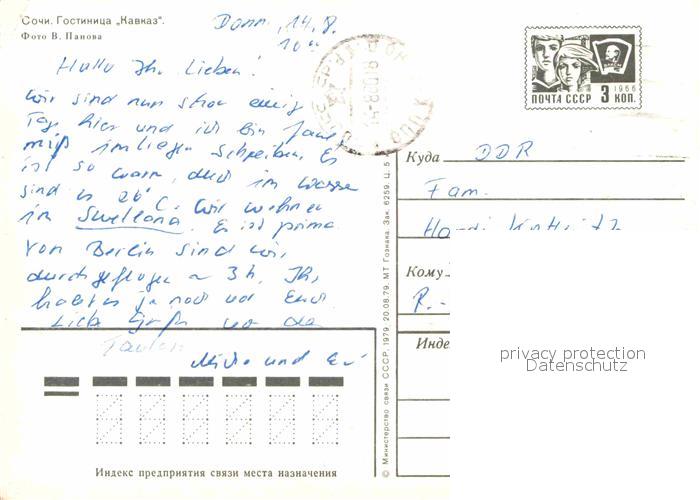 old postcard Sotschi Hotel Kawkaz postalisch gelaufen Ganzsache (eingedruckte Briefmarke) Erhaltung siehe scans [NatalD47]