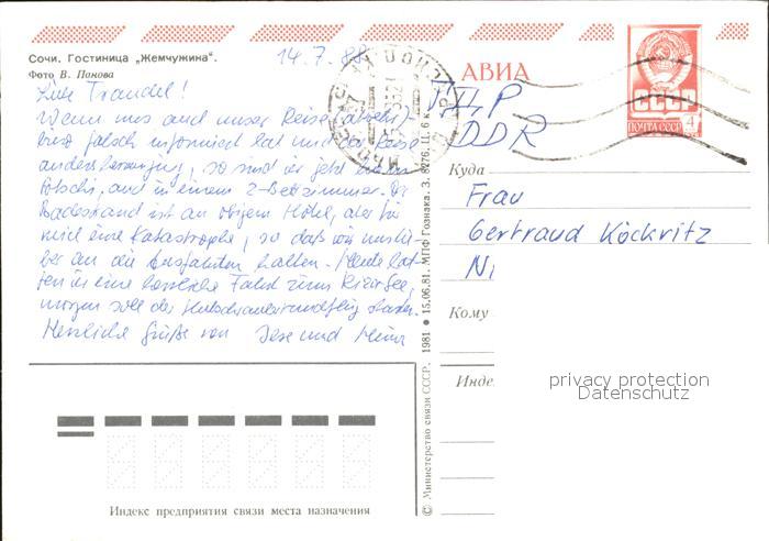 old postcard Sotschi Hotel Schemtschuschina postalisch gelaufen Ganzsache (eingedruckte Briefmarke) Erhaltung siehe scans