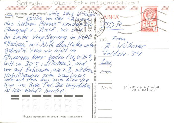 old postcard Sotschi Hotel Schemtschuschina postalisch gelaufen Ganzsache (eingedruckte Briefmarke) Erhaltung siehe scans
