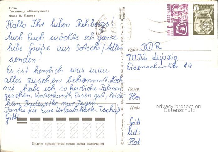 old postcard Sotschi Hotel Zhemtschuzhina postalisch gelaufen Erhaltung siehe scans