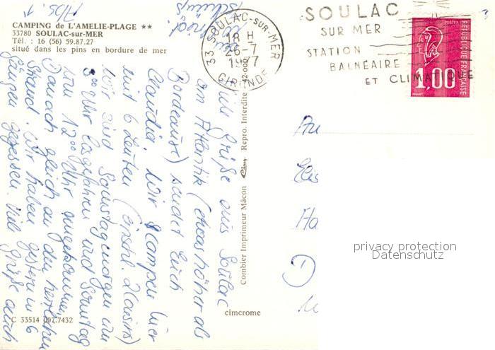 13264759 carte postale Soulac-sur-Mer Camping Amelie Plage postalisch gelaufen Erhaltung siehe scans [KathaD81] KatCode: 11170033433514