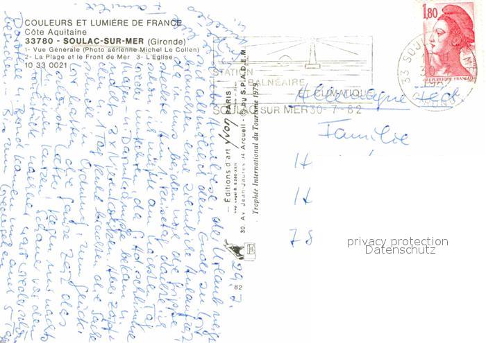 12761114 carte postale Soulac-sur-Mer Fliegeraufnahme mit Strand Kirche postalisch gelaufen Erhaltung siehe scans [LiesaD40] KatCode: 11170033433514