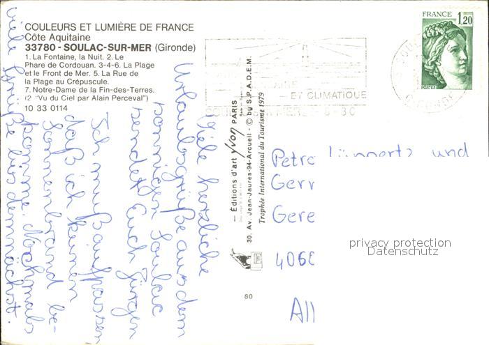 12296978 carte postale Soulac-sur-Mer Fontaine Phare de Cordouan Plage Notre Dame Rue Cote Aquitaine postalisch gelaufen Erhaltung siehe scans KatCode: 11170033433514