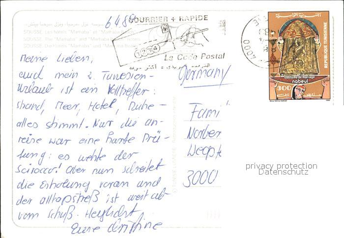 old postcard SOUssE Tunesie Fliegeraufnahme Les Hotels Marhaba postalisch gelaufen Erhaltung siehe scans