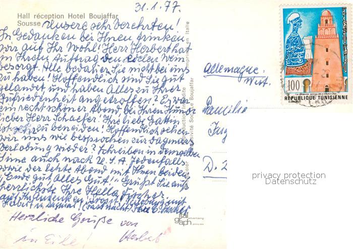 old postcard SOUssE Tunesie Hall reception Hotel Boujaffar postalisch gelaufen Erhaltung siehe scans [WerneD78]