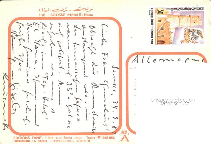 old postcard SOUssE Tunesie Hotel El Hana postalisch gelaufen Erhaltung siehe scans