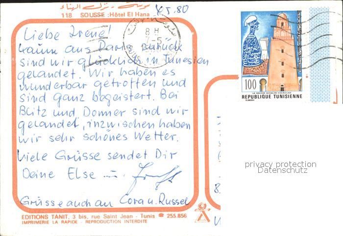 old postcard SOUssE Tunesie Hotel El Hana postalisch gelaufen Erhaltung siehe scans