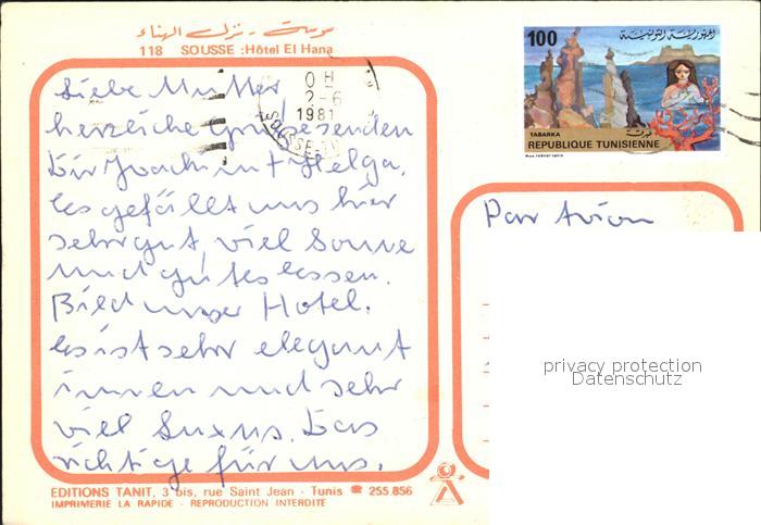 old postcard SOUssE Tunesie Hotel El Hana postalisch gelaufen Erhaltung siehe scans