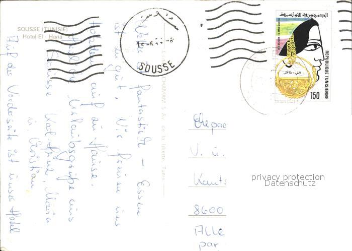 old postcard SOUssE Tunesie Hotel El Hana postalisch gelaufen Erhaltung siehe scans