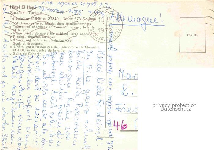74029306 old postcard SOUssE Tunesie Hôtel El Hana et la plage vue aérienne postalisch gelaufen Fliegeraufnahme Erhaltung siehe scans [FriedD77] KatCode: 18520