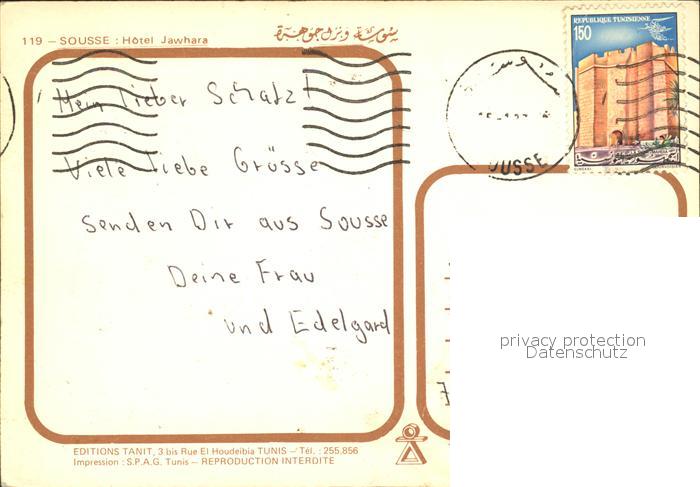old postcard SOUssE Tunesie Hotel Jawhara postalisch gelaufen Erhaltung siehe scans