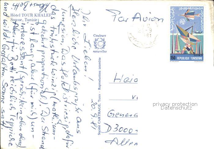old postcard SOUssE Tunesie Hotel Tour Khalef postalisch gelaufen Erhaltung siehe scans