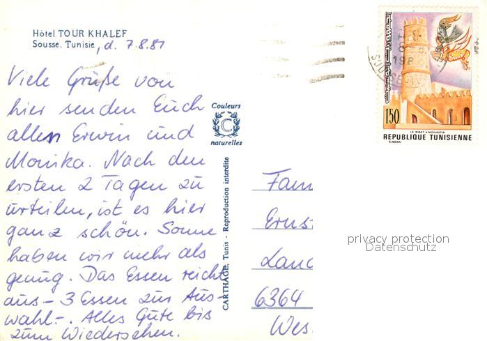old postcard SOUssE Tunesie Hotel Tour Khalef Piscine postalisch gelaufen Erhaltung siehe scans [FriedD77]
