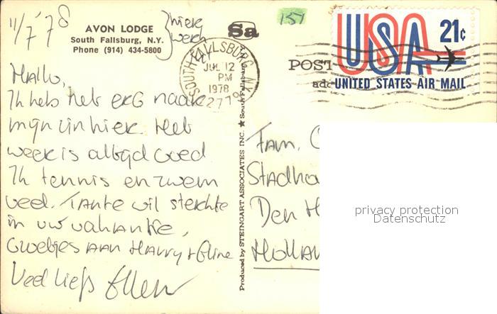 72432454 old postcard South Fallsburg Avon Lodge postalisch gelaufen Erhaltung siehe scans KatCode: 14140340000000