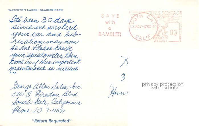73061555 old postcard South Gate Waterton Lakes Glacier Park postalisch gelaufen Erhaltung siehe scans [WerneD78] KatCode: 14140050000000