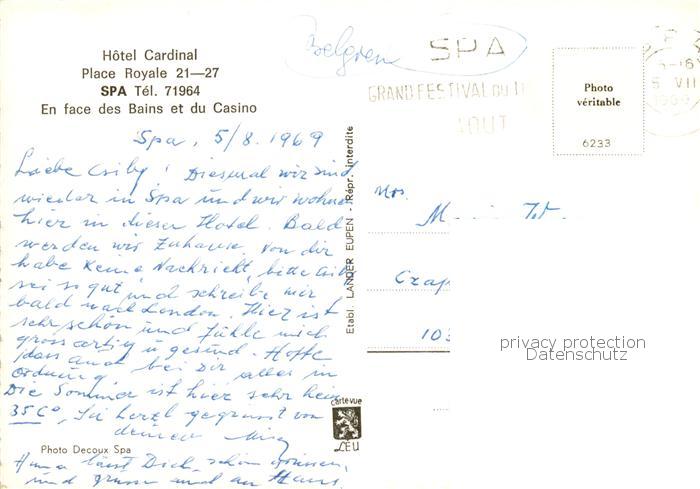 73852343 carte postale Spa Belgium Hôtel Cardinal Place Royal postalisch gelaufen Erhaltung siehe scans [FriedD77] KatCode: 11070063000591