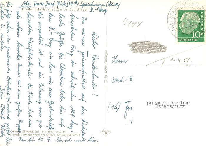 73281636 alte Postkarte Spaichingen Dreifaltigkeitsberg Fliegeraufnahme postalisch gelaufen Erhaltung siehe scans [NatalD47] KatCode: 11110008327046