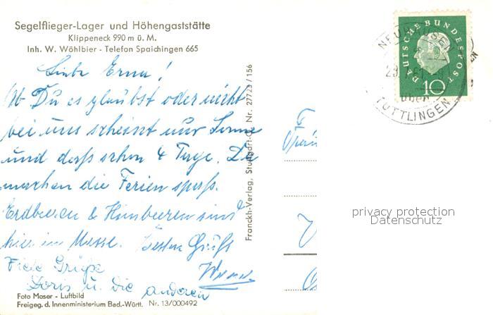 73647090 alte Postkarte Spaichingen Segelfliegerlager und Hoehengaststaette Klippeneck Fliegeraufnahme postalisch gelaufen Erhaltung siehe scans [FriedD77] KatCode: 11110008327046