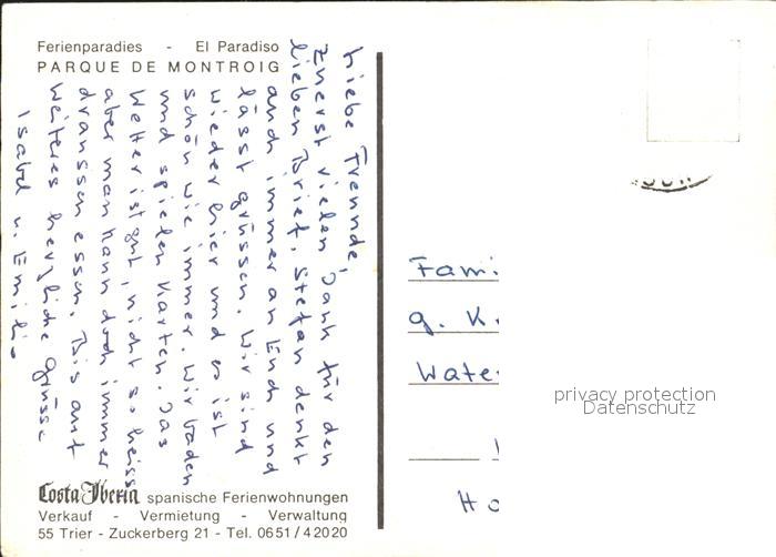 old postcard Spanien Parque de Montroig Ferienparadies postalisch gelaufen Erhaltung siehe scans