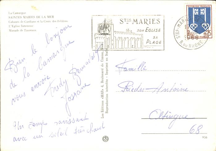 old postcard Spanien Stes Maries de la Mer Rinder Wappen postalisch gelaufen Erhaltung siehe scans