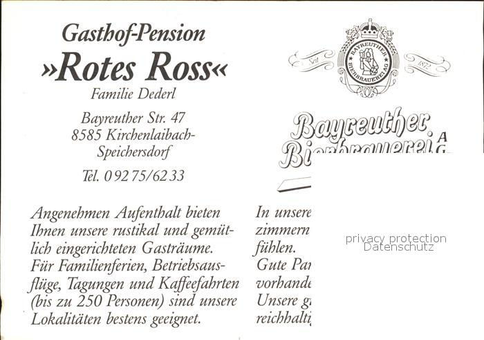 72577668 Speichersdorf Gasthof Pension Rotes Ross Gedenkstein Statue postalisch nicht gelaufen Werbekarte (keine Postkarte) Erhaltung siehe scans [FriedD77] KatCode: 11110009472190