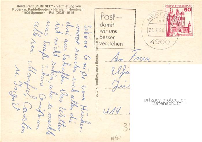 73646632 alte Postkarte Spenge Restaurant zum See Hueckermoor postalisch gelaufen Erhaltung siehe scans [FriedD77] KatCode: 11110005758032