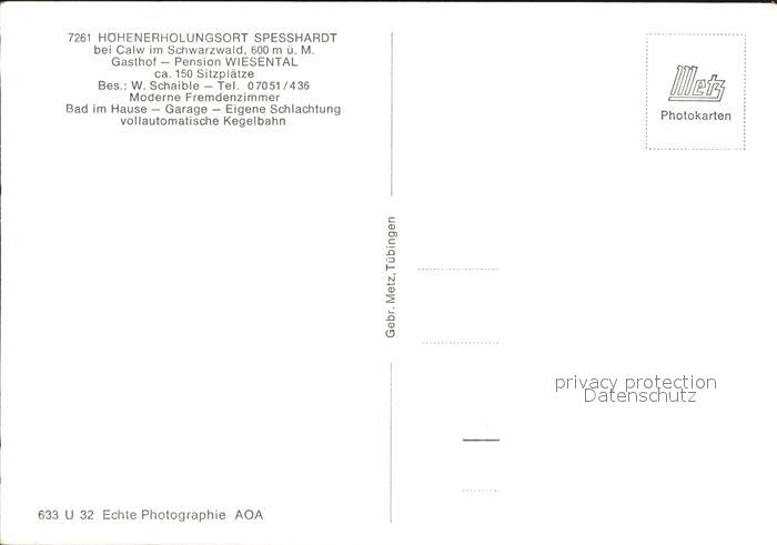 72467729 Spesshardt Hoehenerholungsort Pension Wiesental postalisch nicht gelaufen Erhaltung siehe scans KatCode: 11110008235085