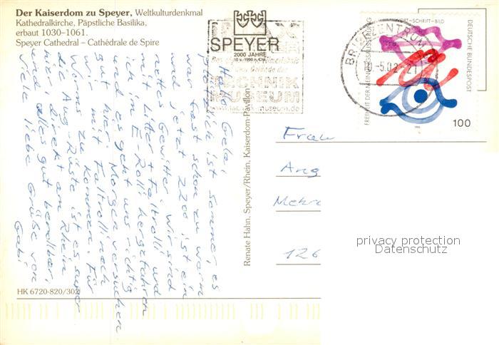 73321791 alte Postkarte Speyer Rhein Fliegeraufnahme mit Kaiserdom Kathedralkirche Paepstliche Basilika postalisch gelaufen Erhaltung siehe scans [WerneD78] KatCode: 11110007318000