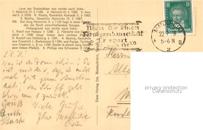 73623431 alte Postkarte Speyer Rhein Kaisergraeber im Dom postalisch gelaufen Erhaltung siehe scans [FriedD77] KatCode: 11110007318000