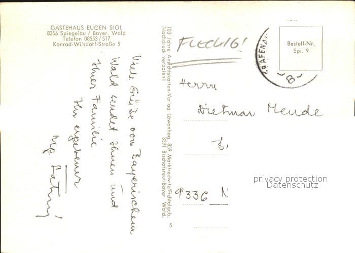 72437642 alte Postkarte Spiegelau Gaestehaus Eugen Sigl postalisch gelaufen Erhaltung siehe scans KatCode: 11110009272149