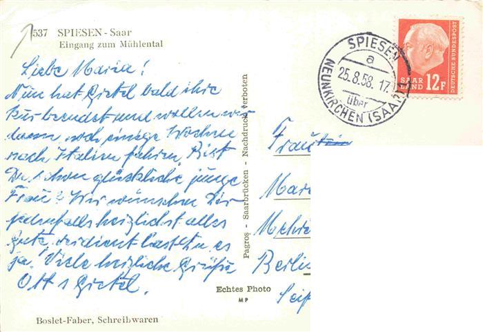 74015203 alte Postkarte Spiesen-Elversberg Neunkirchen Saarland Eingang zum Muehlental postalisch gelaufen Erhaltung siehe scans [WerneD78] KatCode: 11110010043117