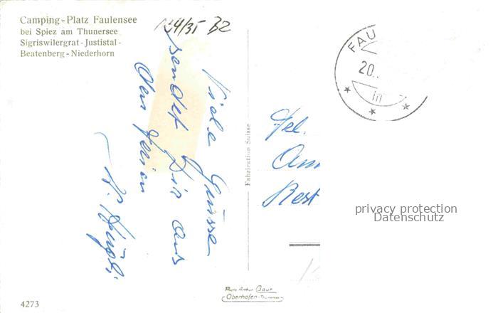 34144547 alte Postkarte SPIEZ Thunersee Niedersimmental BE Campingplatz Faulensee am Thunersee postalisch gelaufen Erhaltung siehe scans [FriedD77] KatCode: 11470060205562
